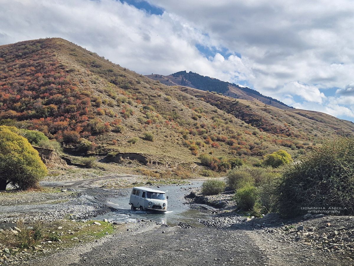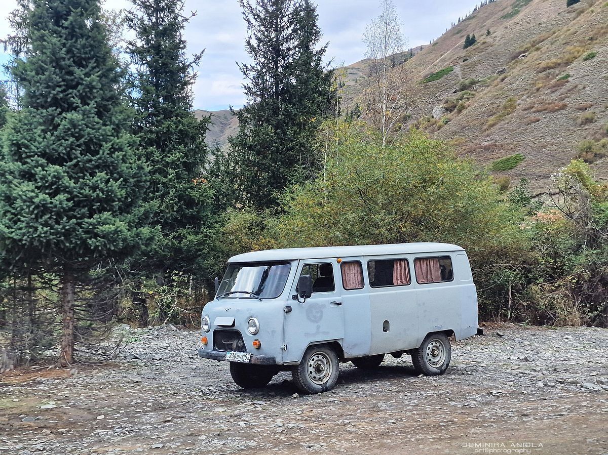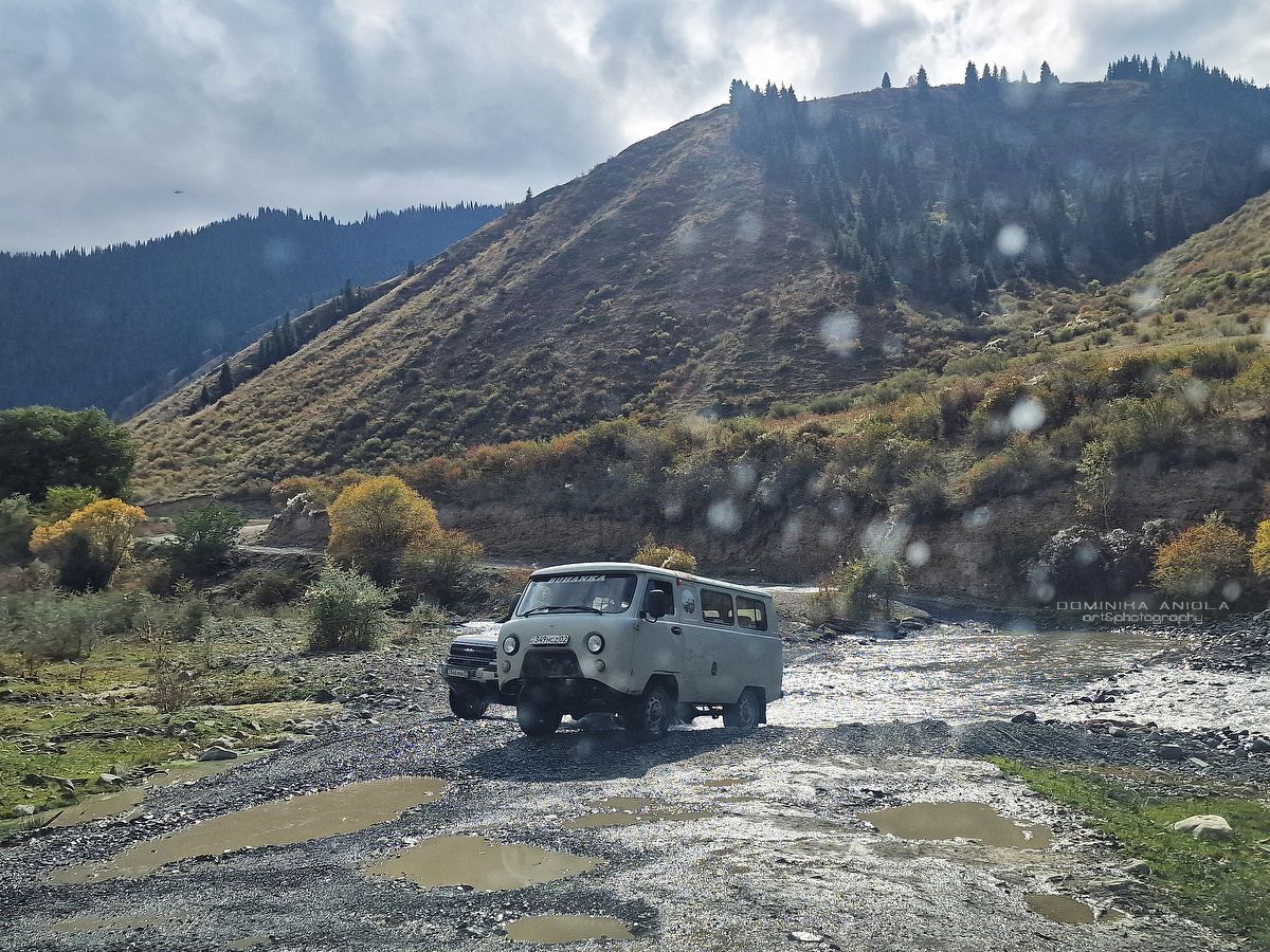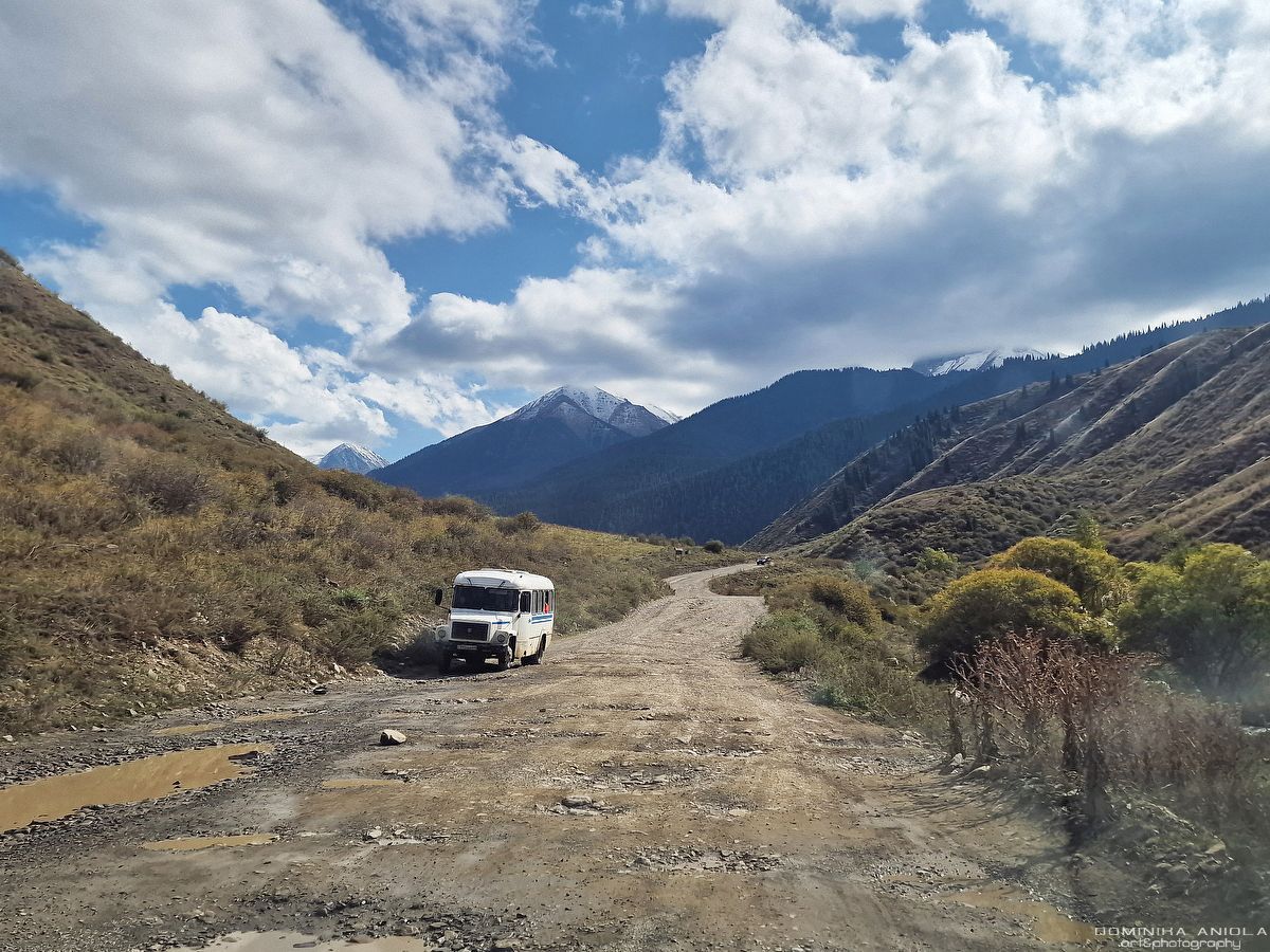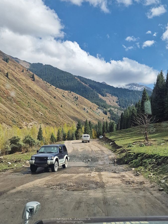 The drive to Kaindy was very peacefull as I only met few locals driving around. And roads were mainly in fairly good condition, nothing unusual for a bit of a remote place. The route to the lake starts in village Saty, where there is a "parking" (just a bit of dirt) where you can leave your normal car (free of charge) as the road up requires 4x4 car. When I arrived, there was a local man there who drove me up to another parking spot 3/4rds of the way, where I had to pay another driver to drive me the last part up. I could walk, but I didn't have enough daytime. Of course all rides are paid cash only! There, from the last parking, there is still about 10 min walk to the lake itself. And the lake is absolutely stunning and worth visiting. Only there I saw more tourists, even if it was a bit outside of season (second half of September). There were even some booths to buy a refreshment or take a picture with a golden eagle. :)